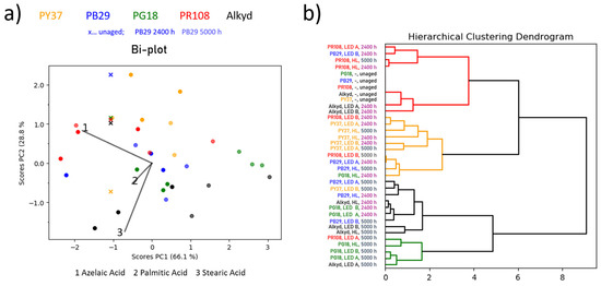 (a) Bi-plot (scores and loadings plot of PC1 vs. PC2) for alkyd-based mock-ups. The colour of the scores corresponds to the pigment type (e.g., blue-coloured score = blue pigment; the binder without pigment is depicted in black) and its transparency to the ageing time when exposed to various illuminants (higher transparency indicated longer exposure times; unaged sample is indicated by a cross). (b) Dendrogram of the HCA of the PC1 and PC2 scores with the sample names highlighted according to the pigment type or ageing time, respectively.