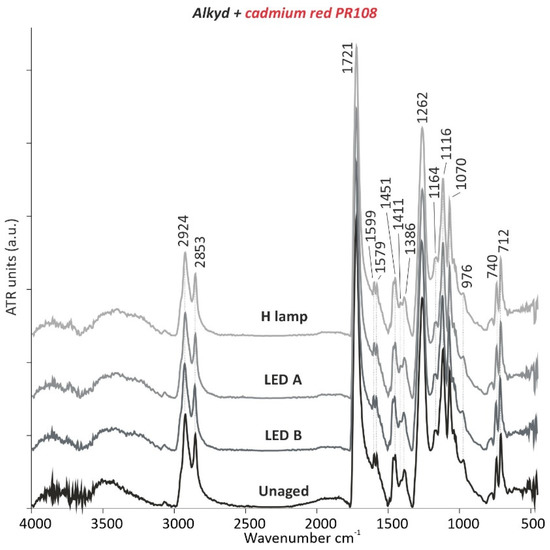 µ-ATR-FTIR spectra of alkyd with the cadmium red PR108 pigment before and after 5000 h of light ageing (LED A: 420 nm, LED B: 460 nm, and H lamp: halogen lamp).