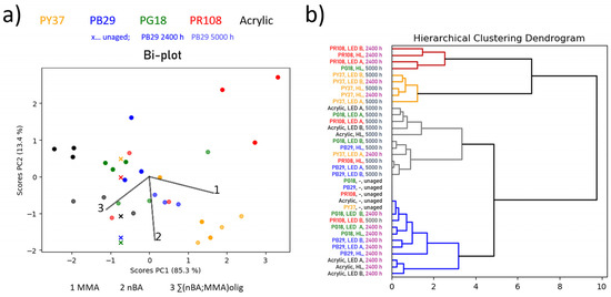 (a) Bi-plot (scores and loadings plot of PC1 vs. PC2) for acrylic-based mock-ups. The colour of the scores corresponds to the pigment type (e.g., blue-coloured score = blue pigment; the binder without pigment is depicted in black) and its transparency to the ageing time when exposed to various illuminants (higher transparency indicated longer exposure times; unaged sample is indicated by a cross). (b) Dendrogram of the HCA of the PC1 and PC2 scores with the sample names highlighted according to the pigment type or ageing time, respectively.