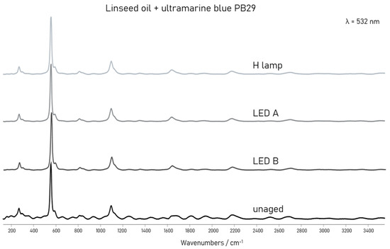 µ-Raman spectra of linseed oil with the ultramarine blue PB29 pigment before and after 5000 h of light ageing (LED A: 420 nm, LED B: 460 nm, and H lamp: halogen lamp).