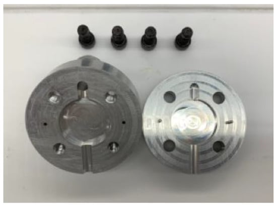Custom split-die injection mold with a cavity size of 25.4 × 6.35 mm used to form samples for compression and hardness testing.