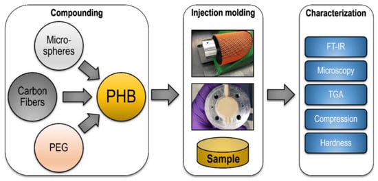 Sample process of preparing PHB based composites, through injection molding, to characterization.