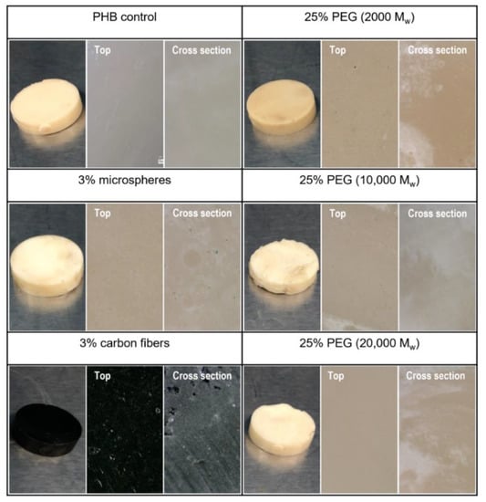 Figure 5 shows the color variations across the samples. The microsphere/PHB sample remained visually similar to the control sample. In the PEG/PHB composites, darker areas of brown were seen along the surface, most noticeably for the 2000 MW sample. This discoloration, could have been the result of the degradation of PHB or PEG; or incomplete mixing between the polymer and additives [29]. Since the PHB was processed below the degradation temperature (Td), the discoloration was likely due to the degradation of the PEG. In fact, previous studies have shown that PEG can start degrading at temperatures as low as 45 °C at relatively low MW values (6000) [30]. The PEG/PHB sample prepared with 20,000 MW PEG had a similar appearance with respect to the control sample. As expected, the carbon fiber/PHB composite showed a significant change in color from tan to black. Additional microscopy photographs can be found in Figure S1.