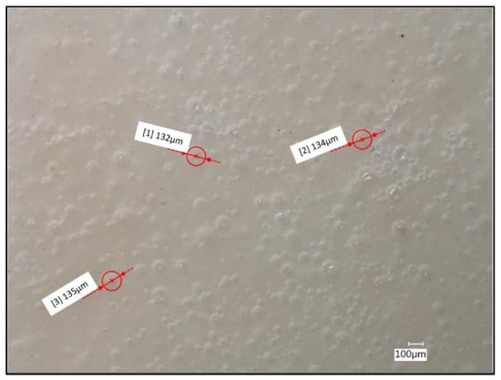 PHB/microsphere (3%) composite sample surface with measured pore diameters of fully formed microspheres. Image taken at 100× under partial-ring lighting conditions.