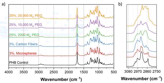 Infrared spectra of the PHB control and composites were collected, as shown in Figure 7. All of the spectra showed a strong absorption band at the 1720 and 1280 cm−1 peaks, corresponding to a C=O carbonyl group and C-O from the ester group, respectively, and are commonly observed when studying PHB [32]. The consistent presence of these peaks and similar peak ratios across the samples suggests that the PHB was mostly unchanged during the extrusion process. This absence of degradation phenomena is further confirmed, when compared against the IR spectra of the unprocessed PHB polymer (shown in Figure S6). The 2930 cm−1 peak corresponds to the alkane groups present in the PEG. Similarly, PHB has a presence of alkane groups at this peak. As a result, the groups for the two molecules overlap causing the peak to broaden [33]. Additional IR spectra that highlight different concentrations of additives can be found in Figure S5.
