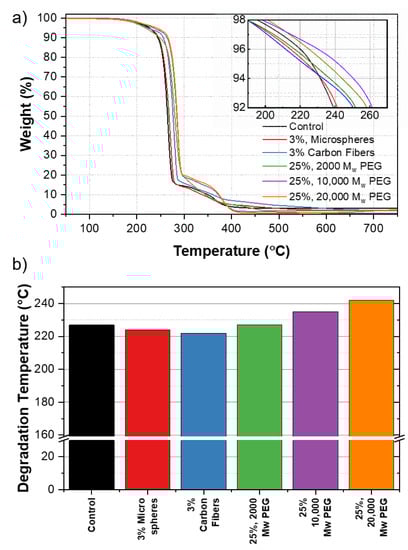 Figure 8b shows the baseline Td value for PHB of 227 °C, corresponding to 5 wt% mass loss. The addition of 3% of the carbon fibers and microspheres shows a negligible change of 222 and 224 °C, respectively. The addition of 25% 2000, 10,000, and 20,000 MW PEG showed a change in Td from 227 °C in the control samples without additives, to 227, 235, and 242 °C, respectively. As the MW of the PEG was increased, the thermal stability of the polymer was improved resulting in a higher temperature of degradation. We believe that this was due to the increasing length of the polymer chain, influencing the thermal stability of the material directly as MW increased [35]. Additional TGA curves for each additive at various concentrations can be found in Figure S7.