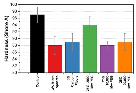 Figure 9 shows a Shore A value of 97 for the control sample. The addition of 3% carbon fibers and microspheres resulted in a decrease in Shore A values to 89 and 88, respectively. Similarly, the addition of 25% 2000, 10,000, and 20,000 MW PEG also reduced the hardness to 94, 88, and 89, respectively.
