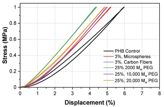 The PHB/microsphere composite showed a decrease in displacement from 6 to 5.2%. In previous work on macromolecular microsphere composite hydrogels, an increase in displacement was seen as a result of the microspheres [37]. This was opposite to our composite. Here, we suggest that the microsphere and carbon fiber additives occupied free space in the polymer matrix. As the samples were compressed, the chains were no longer able to rearrange as freely, which resulted in a decrease in the displacement. Unlike in the hardness tests that applied a force to a specific point, the compression tests applied a force to the entire sample creating a closed system that limited the mobility of the polymer chains.