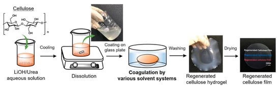 In this study, regenerated cellulose (RC) films were prepared following a slightly modified procedure of the LiOH–urea aqueous system reported elsewhere [41]. Each preparation step is illustrated in Figure 1. The solvent mixture comprising LiOH, urea, and H2O with a weight ratio of 4.6:15:80.4, containing the desired amount of cellulose, was cooled at −14 °C for an hour. The concentration of CNF was fixed at 3 wt%. The cooled mixture was then vigorously stirred for 30 min. Cooling and stirring processes were repeated at least twice to make the cellulose completely dissolve in LiOH–urea aqueous solution. The resulting transparent and viscous solution was degassed by centrifugation at 5 °C and 8500 rpm for 3 min, spread on a glass plate using a spin coating apparatus, and immersed in a coagulation bath at ambient temperature. Various types of solvents with different polarity were adopted as a coagulant. The coagulation conditions, including coagulation time and dielectric constant of each solvent, are shown in Table 1. The coagulation by 5 wt% H2SO4 aqueous solution containing 5 wt% Na2SO4 was carried out for 5 min, which is shorter than the coagulation time of other solvents because the hydronium ions (H3O-) in acidic aqueous medium can quickly diffuse into the cellulose solution and break the LiOH–urea complex shell for the regeneration of cellulose [42]. The hydrogel of regenerated cellulose was then thoroughly washed with distilled water by soaking until the pH reached the neutral region, and dried at ambient conditions for several days until constant weight was attained. RC films composed of MCC were prepared from 9 wt% of MCC–LiOH–urea aqueous mixture following the same procedure as CNF. Figure 2 represents images of RC films with a thickness of around 50 μm prepared from a 3 wt% CNF and 9 wt% MCC solution through coagulation with methanol.