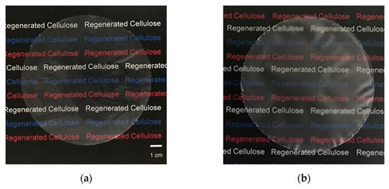 Regenerated cellulose (RC) film, which is composed solely of cellulose, has attracted attention as an environmentally friendly material, especially in food and medicine packaging application due to its biodegradability, gas barrier property, and high mechanical strength [18,19,20]. As cellulose does not melt unlike the common thermoplastics due to the strong hydrogen bonding interactions and physical entanglement, RC film is generally prepared through dissolution, coagulation, and drying processes. Various solvent systems for the dissolution of cellulose have been reported throughout the years, such as carbon disulfide (CS2) [21], N-methylmorpholine-N-oxide (NMMO) [22,23,24], and ionic liquids (ILs) [25,26,27,28,29,30]. Among these solvent systems, aqueous alkali–urea solution has received considerable attention, owing to its simplicity, low toxicity, and rapid dissolution. This solvent system can rapidly dissolve cellulose at low temperatures without producing any hazardous byproducts and significant degradation of cellulose [31]. It has also been reported that the solubility of cellulose in LiOH–urea aqueous solution is higher than that of NaOH–urea solution [32]. In alkali–urea aqueous solution, after 15N and 23Na NMR measurements were clarified, adding urea can effectively improve the stability of the alkali–cellulose complex, owing to the strong interaction between alkali hydroxides and urea, and low temperature can accelerate the breakdown of intermolecular hydrogen bonding among cellulose and, thus, prevent the agglomeration of alkali–urea–cellulose inclusion complexes [33].