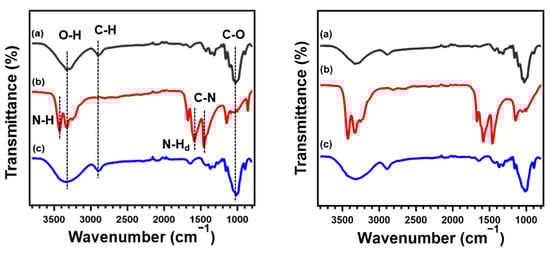 FT-IR spectra of (a) native cellulose, (b) dried mixture composed of cellulose, LiOH, and urea, and (c) regenerated cellulose film regenerated with methanol based on CNF (left) and MCC (right).