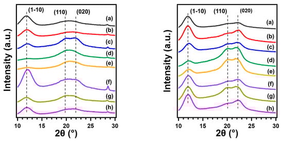 XRD spectra of regenerated cellulose films prepared from CNF (left) and MCC (right) through coagulation using (a) 5 wt% H2SO4 and 5 wt% Na2SO4 aqueous solution, (b) H2O, (c) ethylene glycol, (d) methanol, (e) ethanol, (f) 1-butanol, (g) acetone, and (h) n-hexane.