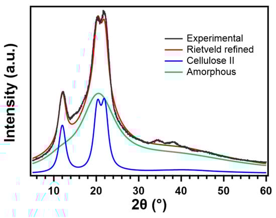 Measurement of the diffractogram performed on RC film prepared from MCC through coagulation with ethanol (black line), calculated total signal (red line), (simulated cellulose II signal (blue line), and simulated amorphous phase (green line).