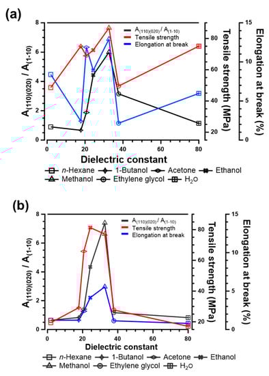 To control the properties of RC film by preparation condition, clarification and visualization of correlation must be crucial. In this study, the polarity of coagulants, which can be represented in dielectric constant, was adopted as a parameter to investigate the correlation between the mechanical properties and crystal structure of RC films. Figure 7 depicts the peak–area ratio of (110) and (020) lattice planes formed by intra- and inter-hydrogen bonding, to (1–10) plane, tensile strength, and elongation at break as a function of the dielectric constant of coagulants. Both RC films prepared from CNF and MCC show superior mechanical properties, as methanol which has a dielectric constant of 32.6 is used for coagulation. Moreover, the peak–area ratio of (110) and (020) crystal planes formed in RC films regenerated with methanol is much higher than RC films coagulated using other solvents. Therefore, there is an apparent correlation between the crystal and mechanical properties of RC films, and the dielectric constant of coagulants. These results revealed the correlation that the polarity of solvent has a strong effect on the interactions among the molecular chains of cellulose during the regeneration process. In addition, the correlation for RC films prepared from CNF is less apparent compared to MCC. This may be because fibrillated cellulose molecular physically intertangle during the dissolution and coagulation process, due to its high aspect ratio and molecular chain length of CNF.