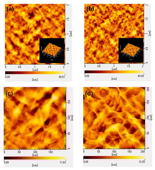 AFM images of regenerated cellulose films prepared from CNF through coagulation with (a,c) 5 wt% H2SO4 and 5 wt% Na2SO4 aqueous solution, (b,d) methanol.