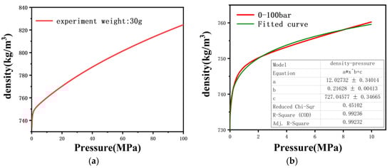 In order to better fit the relationship between density and pressure in the range of low and medium shear rates, the density–pressure curve in the range of 0–10 MPa was intercepted, and the power function was used to fit the curve, which can be represented by: