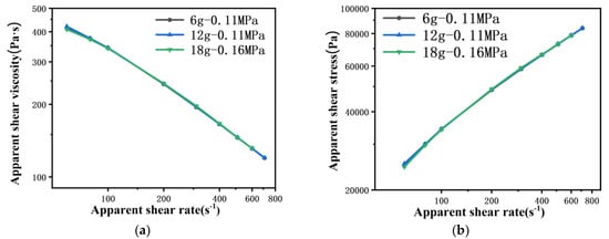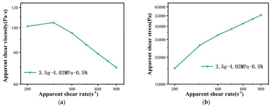 Rheological curves of PP melt flowing through a 100 capillary die under 4 g−4.02 MPa−0.5% (a) viscosity curve and (b) stress curve.