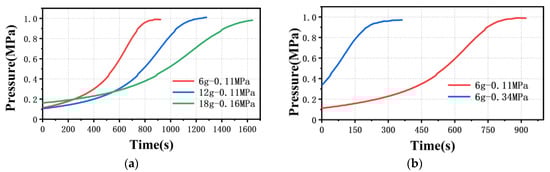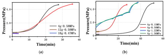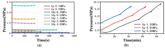 When the pre-compaction pressure is 0.5 MPa and the amount of material is 4 g and 12 g (comparing “4 g–0.58 MPa” and “12 g–0.58 MPa” in Figure 6a), the first three pressure readings () were taken within 5 min, and the pressure data are basically the same. However, it took at least 25 min to measure the fourth pressure point, and the pressure rise curve showed an s-shape, similar to measuring the viscosity through the 500 capillary die. Moreover, the more material in the barrel, the longer it takes to reach steady state flow, which is similar to the pressure rise curve of the 500 capillary die. Note that, when the amount of material is 18 g, the four pressure points were measured in five minutes, and it can be seen from Figure 5b that, until the shear rate is 600 s−1, the pressure is basically around 0.47 MPa.