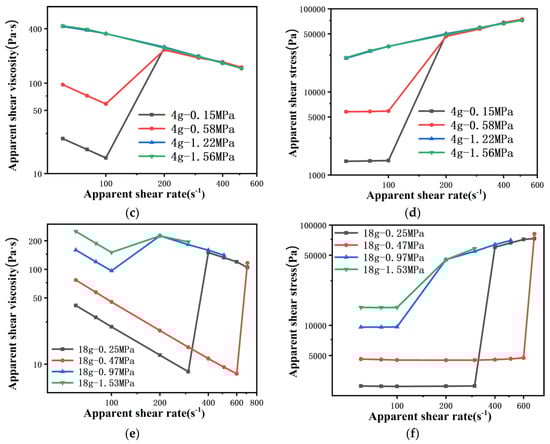 Rheological curves of PP melt flowing through a 200 μm capillary die: with different amounts of material (a) viscosity curve and (b) stress curve, different pre-compaction pressures at 4 g (c) viscosity curve and (d) stress curve, different pre-compaction pressures at 18 g (e) viscosity curve and (f) stress curve.
