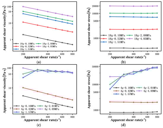 Rheological curves of PP melt flowing through a 100 μm capillary die: the amount of material is 18 g (a) viscosity curve and (b) stress curve, the amount of material is 4 g (c) viscosity curve and (d) stress curve.