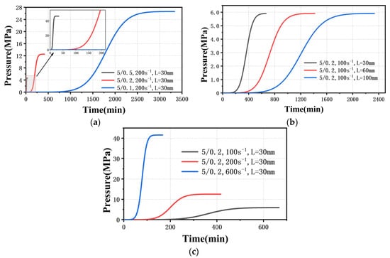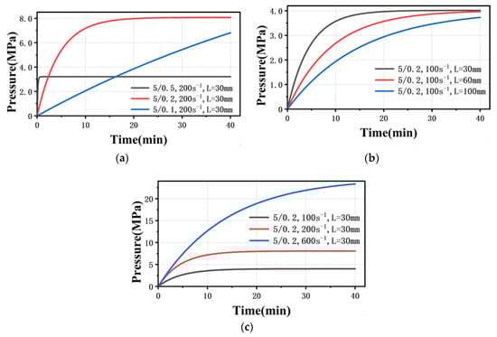 Theoretical pressure rise curves under different parameters with changeable isothermal compressibility (a) different amounts of material (b) different die sizes (c) different shear rates.