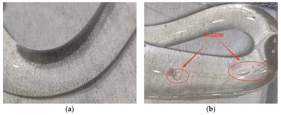 A flat plug was used instead of a die to measure polymer isothermal compressibility by the capillary rheometer. As shown in Figure 2, the isothermal compressibility coefficient of the polymer melt is expressed by the slope. It is clear that the isothermal compressibility is variable in the range of 0–10 MPa, but basically remains unchanged in the range of 10–100 MPa, which is similar to Leonor’s study []. This might be caused by the presence of bubbles in the polymer in the barrel. The polymer pellets are poured into the barrel above the flat plug by the conventional measurement methods. After the polymer was completely melted, the flat plug was disassembled and the melt in the barrel was extruded, as shown in Figure 10. The melt is divided into two parts as it falls from the barrel, and there are no bubbles in the first stage close to the die (see Figure 10a), while bubbles can clearly be seen in the second stage (see Figure 10b). This implies that the conventional measurement method cannot completely squeeze out the bubbles, and ultimately affects the isothermal compressibility coefficient. Obviously, there are no bubbles entering the die during the measurement, nor will it change the viscosity of the melt flowing through the die. According to Equation (3), when the volume flow rate, the die parameters and the viscosity do not change, the pressure under steady state flow will not change either. Therefore, a small number of bubbles will not affect the accuracy of the measurement results.