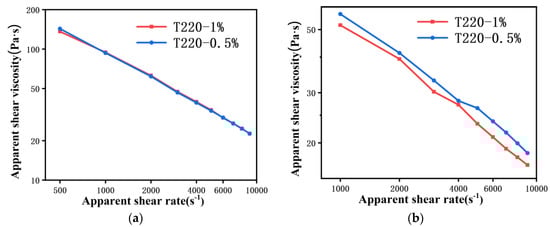 Limited by the minimum speed of the rheometer piston, the shear rate of PP melt flowing through the 100 μm capillary die starts from 200 s−1, and the shear rate ranges from 200 s−1 to 800 s−1. As indicated in Figure 7, this inaccurate measurement becomes more obvious as the die diameter is reduced to 100 . When the amount of material is 18 g, no matter what the pre-compaction pressure is, accurate pressure data cannot be obtained in the range of low and medium shear rates (Figure 7a,b and Figure 8a). This fully illustrates that the pressure take-over tolerance in one cycle is less than 1% during the experiment, and then the wrong pressure value is collected. Moreover, when the amount of material is 4 g and the pre-compaction pressure is greater than 1.5 MPa, the viscosity drops in a zigzag manner, while the stress curve rises in a stepped shape with the shear rate. This is because, when the shear rate rises by 100 s−1, the piston speed only rises by . The piston speed interval between the two shear rates is too small, resulting in a take-over tolerance of less than 1% when measuring the pressure at the next shear rate, and problematic pressure data are collected. Only if the piston speed is further increased can the take-over tolerance in one cycle be greater than 1% (Figure 8b). This means that, when the die diameter is reduced to 100, it is not appropriate to set the pressure take-over tolerance to 1%, even if the amount of material is reduced and the pre-compaction is increased.