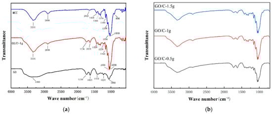 The FTIR spectra of (a) microcrystalline cellulose (MCC), graphene oxide (GO), GO plus 0.5 g MCC composite (GO/C-1 g); (b) GO plus 0.5 g MCC composite (GO/C-0.5 g), GO plus 1 g MCC composite (GO/C-1 g), and GO plus 1.5 g MCC composite (GO/C-1.5 g).