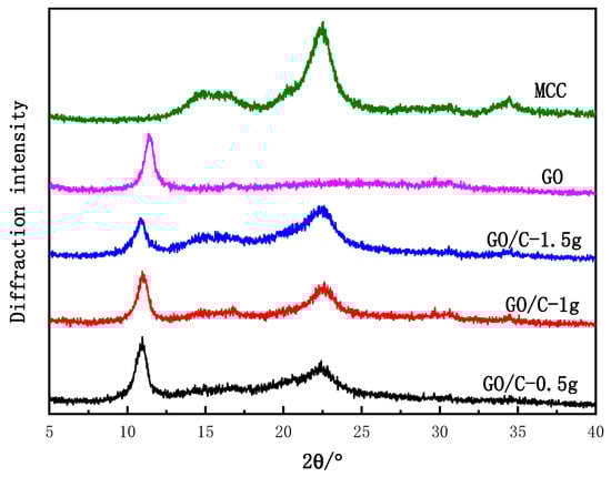 Pure GO had a characteristically strong XRD peak at 2θ = 11.4° (Figure 2), corresponding to the (001) crystal plane of GO. In addition, according to the Bragg equation, the layer spacing of GO was estimated at 0.77 nm, which is similar to results reported in the literature []. The MCC XRD peaks appeared at 2θ = 14.8°, 16.5°, 22.5°, and 34.5°, corresponding to the crystal planes 101, 10, 002, and 040, respectively. This result indicated that MCC had a cellulose I-type crystal structure [,]. The XRD pattern of GO/C-1 g was similar to those of GO and MCC: a strong diffraction peak was observed at 10.9°, which was slightly left-shifted from the characteristic GO diffraction peak, and at 22.5°, which was consistent with the characteristic peak position of the 002 crystal plane of cellulose I. Furthermore, two smaller diffraction peaks were found at 2θ = 14.9° and 16.7°, corresponding to the 101 and 10 crystal planes of cellulose I, respectively. The amount of MCC added had almost no impact on the position of the characteristic peaks of the composite (Figure 2). As the amount of added MCC increased, the intensity of the diffraction peak of the composite at around 2θ = 11° decreased, but the characteristic peak intensity of cellulose was somewhat increased. This result indicated that as the amount of added MCC increased, the interactions between the acid-hydrolyzed cellulose and the GO sheet layer also increased, disrupting the order of the GO sheet and reducing the intensity of the characteristic peak. As the added MCC increased, the proportion of cellulose in the composite material increased concomitantly, increasing the intensity of the characteristic cellulose peak (Figure 2). A hydrogen bond was formed between GO and MCC, which also confirmed the results of FTIR.