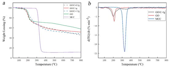 It can be seen from the TG/DTG curves in Figure 4 that the thermal decomposition of MCC, GO, and composites is mainly completed in one stage. The thermal weight loss value is shown in Table 2. It can be seen from Table 2 that the T0 values of the three composites are smaller than those of MCC and GO, which is caused by the introduction of sulfonic acid groups during acid hydrolysis [,,]. The TG/DTG curves of the composites are obviously different from those of MCC and GO. However, the thermal decomposition of MCC occurred in one stage, indicating that the acid hydrolysis of MCC occurred during the preparation process, and the composite was formed by the interaction between MCC and GO sheets. This result was consistent with the conclusions of XRD and FTIR. Due to the poorer thermal conductivity of cellulose than GO, the interlacing of cellulose and GO sheets in GO/C-1 g hindered the heat transfer. This makes the thermal decomposition temperature range of GO/C-1 g significantly wider than that of GO, and Tf is higher than that of GO. With the increase in MCC content, the more sulfonic groups introduced into the composites during acid hydrolysis, and the lower the T0 value. When the addition amounts of MCC were 0.5 g and 1 g, the interaction between acid-hydrolyzed cellulose and the GO sheet could improve the thermal stability of the composites, and the carbon residue of the composites was also higher. However, as the addition of MCC continues to increase, the more insufficient the acid hydrolysis reaction is, the more large-scale MCC remains. The carbon residue of MCC is relatively low, which makes the carbon residue of GO/C-1.5 g lower than GO/C-1 g. Therefore, when the MCC content is 1 g, the thermal stability of the composite reaches the maximum.