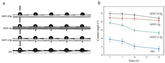 The distilled water contact angles of the GO, GO/C-0.5 g, GO/C-1 g, and GO/C-1.5 g sample films were tested. Alterations in contact angle were detected within 20 s (Figure 5). At all time points, the contact angles measured for GO/C-0.5 g, GO/C-1 g, and GO/C-1.5 g were greater than that of GO (Figure 5a), which was probably because of hydrogen bonding between cellulose and GO, and the resultant decrease in the number of oxygen-containing groups on the GO sheet. Thus, the hydrophobicity levels of the composites were higher than that of GO. As shown in Figure 5b, the hydrophobicity of the composites decreased with the addition of MCC. The hydrophobicity of GO/C-0.5 g was higher than that of GO/C-1 g. However, there was no significant difference between them. The water contact angles of GO/C-0.5 g and GO/C-1 g were 91.85° and 90.55° at 20 s, respectively. However, with the addition of MCC, the water contact angle difference is gradually obvious. The gap between GO/C-1 g and GO/C-1.5 g is larger than that between GO/C-0.5 g and GO/C-1 g. This is because the hydrophobicity of cellulose is poor. With the continuous addition of MCC, the hydrophobicity of the composite decreases. In addition, when the MCC content continues to increase, the incomplete acid hydrolysis of MCC may also affect the hydrophobicity of the composites. Overall, the composites are more hydrophobic than GO. The hydrophobicity of GO/C-0.5 g and GO/C-1 g in the composites is more excellent.