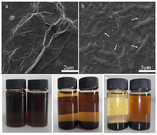 Figure 6c–e show photographs of GO (left) freeze-dried powder and GO/C-1 g (right) freeze-dried powder dispersed in water at a concentration of 2 mg/mL on days 1, 6, and 78, respectively. As shown in Figure 6c, the mixture of the two samples showed a relatively stable state in the initial three days after dispersion. There is no obvious precipitation at the bottom of the sample bottle. As shown in Figure 6d, with the passage of time, partial precipitation appeared at the bottom of the two sample bottles on the sixth day, and the upper liquid gradually became clear. As shown in Figure 6e, the color of the upper liquid of GO/C-1 g (right) composite is obviously deeper than that of GO (left) after 78 days of storage. This shows that the stability of the GO/C-1 g composite dispersion is stronger than that of GO. This is because the acid hydrolysis cellulose after GO preparation was used in the experiment, and there were micron and nano-scale cellulose in GO/C composites. The depolymerization of cellulose macromolecular chains and the breaking of hydrogen bonds are the main factors leading to the depolymerization of cellulose in sulfuric acid []. H2SO4 aqueous solution with adequate concentrations is able to break the hydrogen bonds, because H+ favors the attack on oxygen atoms of cellulose hydroxyl groups, and bisulfate and sulfate anions prefer to attract hydrogen atoms of cellulose hydroxyl groups []. After acid hydrolysis, a small amount of negative charges are introduced on the surface of nanocellulose, and the mutual exclusion of negative charges makes these composites have a strong dispersion ability in water [,]. In addition, one-dimensional cellulose was interspersed between two-dimensional GO sheets. There was a certain steric effect between the two, which hindered the agglomeration between GO sheets and cellulose, respectively, which was also conducive to the stable dispersion of GO/C in the solution []. Thus, the stability of GO/C composites in water is higher than that of GO.