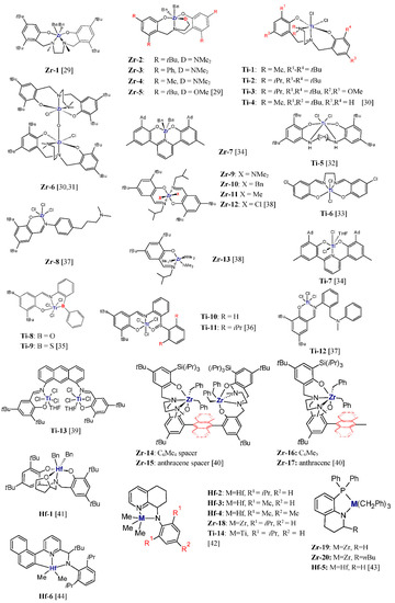 29] compared the effects of the symmetry of complexes, steric bulk of the substituent at the aryl ring, and the type of activator on the ethylene/1-hexene copolymerization behavior of zirconium diamino-bis(phenolate) complexes