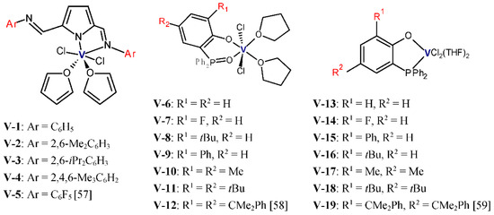 Vanadium complexes bearing ligands featuring sulfur, nitrogen, and oxygen donors were screened for the copolymerization of ethylene and 1-hexene in the presence of dimethylaluminum chloride as an activator and ETA as reactivator by Homden et al. [