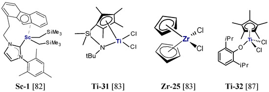 34]. Both complexes in conjunction with MAO turned out ineffective in that process. The titanium catalyst exhibited very low, 3 kg/(mol