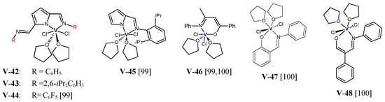 As results from the review of the literature reports on copolymerization of ethylene with 1-olefins show, it is hard to directly compare the performance of the complexes which are used in this process due to the different copolymerization conditions adopted for the experiments, and, in particular, ethylene pressure and 1-olefin concentration values. The studied complexes contained ligands with various denticity and with different donor atoms, and their catalytic performance in copolymerization may be significantly modified, not only by ligand backbone, but also by the type of substituents on the aromatic rings (the effects of their steric and electron donor properties need to be considered). Since the living polymerization catalysts and new coordination polymerization techniques were developed, the group 4 metal complexes made it possible to obtain block copolymers and multiblock copolymers which, so far, could not be produced with the use of the vanadium catalysts. It should also be noted that when the vanadium complexes and the titanium/zirconium complexes with the ligands of the same structure are used in copolymerization, the former usually exhibit higher comonomer incorporation ability and produce more uniform copolymers. However, it should also be stressed that when ethylene/1-octene copolymerization with vanadium complexes activated by EtAlCl2 is conducted with no reactivator, higher comonomer concentrations in the reaction medium may yield mixture of products (copolymerization in the presence of V-32 and V-33). This is probably due to the simultaneous presence of various types of active sites formed by reduction of the initial vanadium compound.