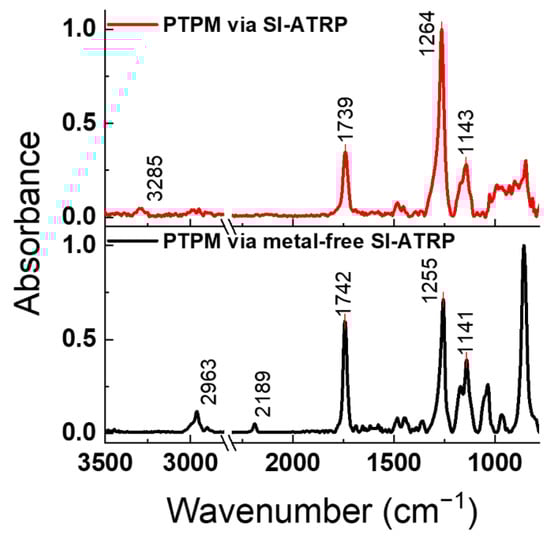 Normalized FTIR spectra of PTPM brushes synthesized via SI-ATRP and metal-free SI-ATRP. The spectra are normalized for clarity due to low absorbance intensity observed for the thin PTPM brushes prepared via classical SI-ATRP.