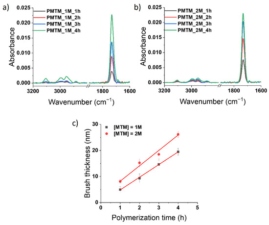 FTIR spectra of PMTM brushes captured after various times of metal-free SI-ATRP carried out using either 1 M (a) or 2 M (b) monomer concentration. The dependency of PMTM brush thickness (measured by AFM) vs. polymerization time (c).