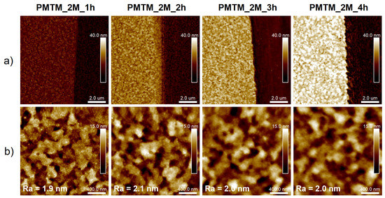 The AFM images of the PMTM brushes captured at the edge of the scratch show a gradual increase in the brush thickness with polymerization time (Figure 4a and Figure S4). The obtained high-resolution topography maps (Figure 4b) confirm the formation of a homogeneous layer on the ITO substrate. It is worth emphasizing that the brushes are characterized by low roughness parameters (average roughness Ra~2 nm) that are virtually the same for each sample (Figure 4b).