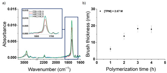 (a) FTIR spectra of PTPM brushes obtained after various times of metal-free SI-ATRP with the zoomed range corresponding to the absorbance of carbonyl group and (b) dependence of brush thickness (measured by AFM) vs. polymerization time.