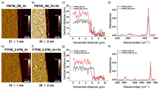 In order to check the activity of the chain ends, PMTM_2M_3h and PTPM_2.67M_3h were subjected to the second polymerization using the same conditions (the samples will be abbreviated as PMTM_2M_3h+3h and PTPM_2.67M_3h+3h). Comparing the AFM images of the PMTM brush before and after the second polymerization (Figure 7a,b), one can notice a significant increase in the polymer layer thickness from 21 nm to 34 nm (Figure 7a–c). The percentage increase could be estimated at 62%, which is in good agreement with the calculated percentage increase (51%) of absorbance from the FTIR spectra (Figure 7d). The similar effect was observed for the PTPM brush. After 3 h of additional polymerization, the thickness of the brushes increased from 18 nm to 28 nm (Figure 7e,f), which equals to a 56% increase (Figure 7g). Based on the presented results for the extended polymer chains, we indicated that, for both brushes, the activity of the chain ends seems to be maintained after finishing the first polymerization, which enables the further elongation of the polymer chains. Therefore, the observed exemption of polymerization in the case of the PTPM brushes after 3 h is likely not associated with the irreversible termination of the polymer chains. One may rather expect the occurrence of some other side reactions that could hinder the brush growth.