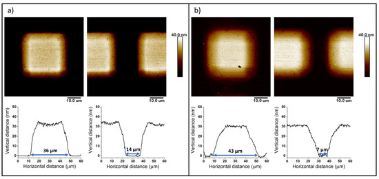 The AFM characterization of the patterned PMTM brushes also allowed the identification of the difference between the polymerizations with the TEM grid facing different sides to the light. One grid position (with the shiny side faced to the LED lamps) gave the pattern with sharp edges of squares (square diameter = 36 μm) and well-visible spaces between neighboring squares (gap size = 14 μm) (Figure 10a). The obtained dimensions of the created PMTM patterns slightly vary from its real size (see SEM measurements of TEM grid, Figure S6) by about a few micrometers. It may be explained by the convolution of the AFM tip shape in the obtained images.