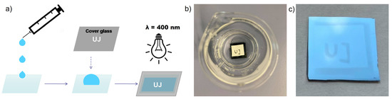 In order to present the ease of the developed method, we prepared a homemade photomask made of sticky foil with the inscription “UJ”, which states the Polish abbreviation of Jagiellonian University (Figure 11a,b). The foil was placed on the glass slide used to cover the initiator decorated substrate with polymerization solution. The 4-h polymerization enabled to obtain the pattern visible by the naked eye (Figure 11c). According to the presented results, it is expected that a much more complicated pattern could be formed depending on the used photomask.