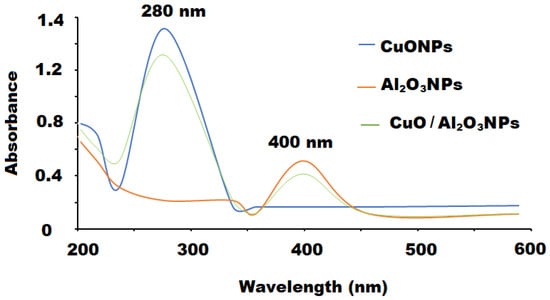 UV-vis spectra of CuONPs (λmax = 280 nm), Al2O3NPs (λmax = 400 nm) and CuO/Al2O3 nanocomposite measured at absorption wavelenth ranged between 200–500 nm.