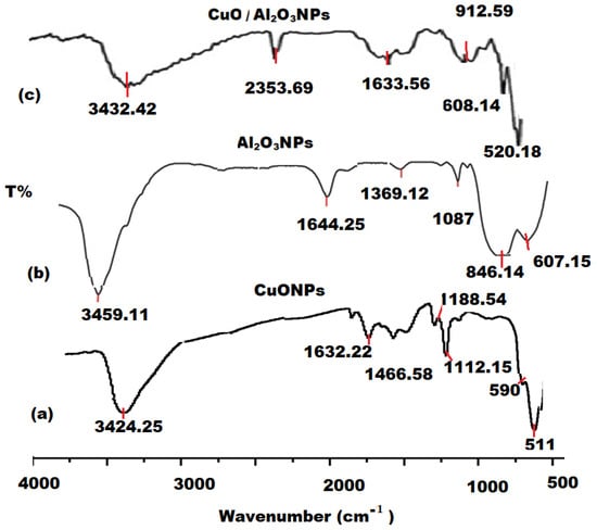 The FT-IR spectra of the pre-synthesized CuONPs, Al2O3NPs, and CuO/Al2O3 nanocomposite were performed in the range in range of 400–4000 cm−1. The FT-IR spectrum of CuONPs (Figure 4a) showed different absorption bands at 3424.25 cm−1 (O-H stretching vibration), 1632.22 cm−1 (O-H bending vibration of absorbed water), 1466.58 cm−1 and 1112.15 cm−1 (CO2 of the surrounding atmosphere), and 590 cm−1 and 511 cm−1 (Cu-O stretching bond formation). The obtained results are in agreement with those previously reported [53]. Figure 4b, described the FT-IR spectrum of Al2O3NPs. Broad and weak absorption bands appeared at 3499.11 cm−1 and 1644.25 cm−1 were due to stretching and bending O-H vibration of absorbed water, respectively; the band observed at 1369.12 cm−1 was corresponding to stretching vibration of Al-OH bond, 1087.00 cm−1 assigned to be corresponding to strong C-O stretching vibration. The peaks at 846.14 cm−1 and 607.15 cm−1 correspond to the Al-O bond [52]. In the CuO/Al2O3 nanocomposite FT-IR spectrum, different absorption vibration peaks were recorded at 3432.42 cm−1 (O-H stretching vibration), 2353.69 cm−1 (O=C=O of the surrounding atmosphere and 1633.56 cm−1 (O-H vibration mode of water). The appearance of two stretching vibration peaks at 520.15 and 608.14 cm−1 indicated the formation of CuO/Al2O3 nanocomposite (Figure 4c).