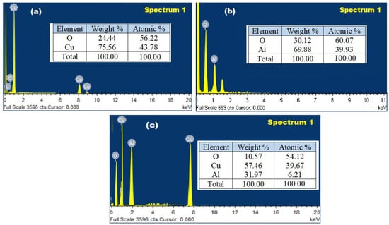Energy Dispersive X-Ray (EDX) analysis of (a) CuONPs, (b) Al2O3NPs and (c) CuO/Al2O3 nanocomposite.