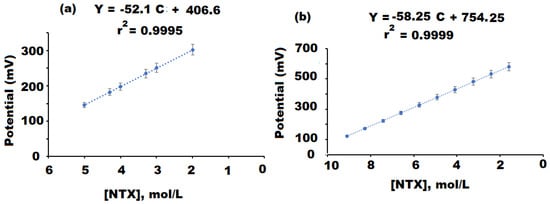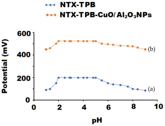 NTX reacts with TPB to produce a very stable complex NTX-TPB, which is soluble in THF. The conventional NTX-TPB and modified coated wire NTX-TPB-CuO/Al2O3NPs nanocomposite sensors were designed by mixing the electroactive materials (ion pairs) with PVC and a solvent mediator (o-NPOE) using THF. The current study suggested the use of a high dielectric constant (o-NPOE, ) serves as a fluidizer allowing the homogenous dissolution of the electroactive materials and facilitating its mobility and diffusion through the polymeric matrix of the membrane. Also, it enhances the selectivity coefficient of the sensor by offering a suitable mechanical property for the coated membrane [53]. Table 1 reported the effective potential response and the potentiometric behavior of the constructed NTX-TPB and NTX-TPB-CuO/Al2O3NPs nanocomposite sensors. The obtained data showed that the designed sensors exhibited Nernstian behavior with slopes of EmV = (52.1 ± 0.2) log [NTX] + 406.6 and EmV = (58.25 ± 0.3) log [NTX] + 754.25 with linearity ranges 1.0 × 10−5–1.0 × 10−2 mol L−1 (r2 = 0.9995) and 1.0 × 10−9–1.0 × 10−2 mol L−1 (r2 = 0.9999) for the above-mentioned sensors, respectively (Figure 8a,b). The addition of CuO/Al2O3 nanocomposite to modify the conventional NTX-TPB sensor enhanced the potential response of the designed sensor (NTX-TPB- CuO/Al2O3 nanocomposite) to a wider linear detection range with high sensitivity towards the detection of NTX solution. These results can be attributed to the large surface area of the added nanoparticles which increased the surface conductivity of the designed modified sensor. Additionally, the higher detection results observed by using the modified sensor could be due to the high dielectric permittivity value of CuONPs (104) and Al2O3NPs (7.8–11.1) at ambient temperature [58,59]. The dynamic response of the designed NTX-TPB conventional and modified NTX-TPB-CuO/Al2O3NPs nanocomposite sensors were investigated under optimized experimental conditions to detect the difference between the instant potential time and its steady-state value (1 mV) [60]. The recorded dynamic responses were found to be 70 s and 50 s for the above-mentioned conventional and modified sensors, respectively. It was observed that the modified sensor with metal oxide nanocomposite exhibited a fastness response with high mechanical stability more than the conventional type. The modification of the membrane with high surface area to volume ratio metal oxides nanocomposite and new unique physicochemical properties enhances the electrical conductivity of the modified sensor towards the detection of the tested analyte in the sample. Moreover, the remarkable electrical and exceptional capacity characteristics of metal oxides nanocomposite such as the high charge transfer resulting at the nanomaterial interfaces are of paramount importance when the nanomaterials are employed as transducing materials in sensing applications [61].