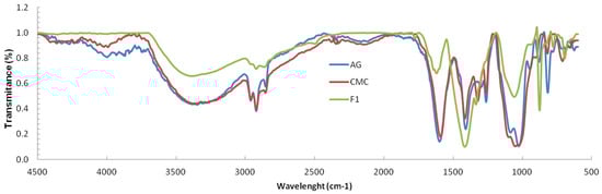 Fourier transform infrared (FTIR) spectra of the AG, CMC and F1 synthesized film.