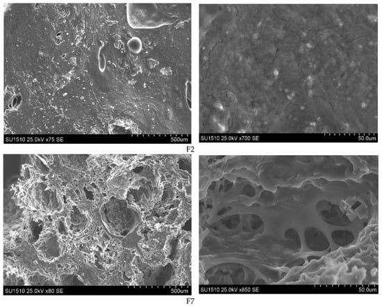The SEM technique was used to visualize the morphological characteristics of lyophilized hydrogel films. Images of the films surface and section morphology are highlighted in Figure 2, for F2 and F7 samples, and in Figure S1, for all other samples. We observed that all films were compact and presented surfaces with aggregates and roughness. However, as can be observed from the cross-section images, all films presented areas with large pores of irregular sizes and shapes.