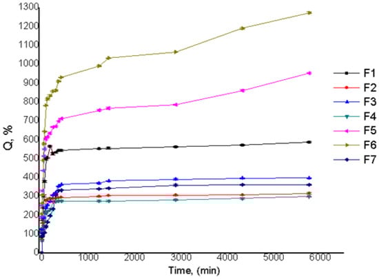This can be explained due to the higher ECH crosslinker concentration of sample F7, which determined a more extensively crosslinked polymeric network. The polymer concentration influenced the swelling ratio: at low polymer concentrations, higher swelling ratios were obtained compared to the samples with high concentrations that showed low swelling ratios. These results demonstrated that the swelling ratio was dependent both on the polymer and crosslinking agent concentration (Figure 3).